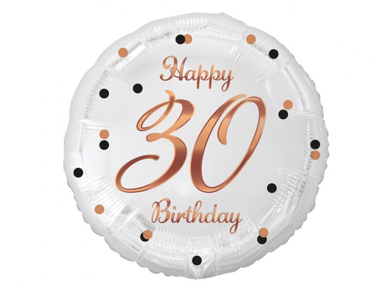 Balon foliowy z helem „B&C Happy 30 Birthday”, biały, nadruk różowo-złoty, 45 cm (18 cali)