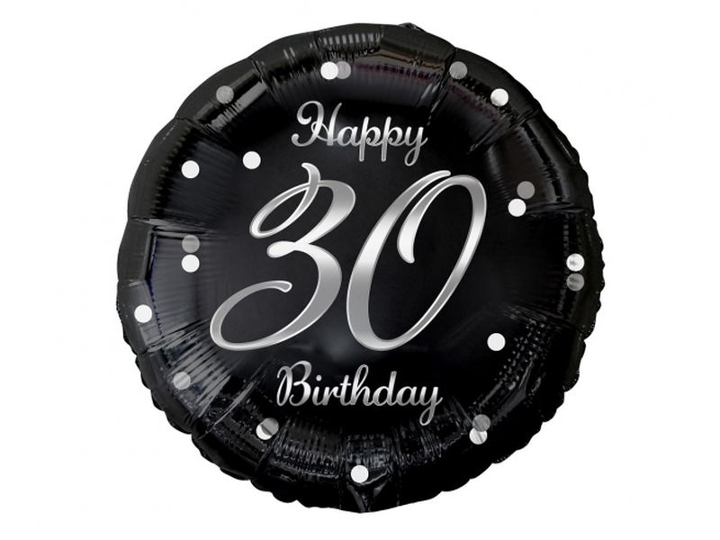 Balon foliowy z helem „B&C Happy 30 Birthday”, czarny, nadruk srebrny, 45 cm (18 cali)