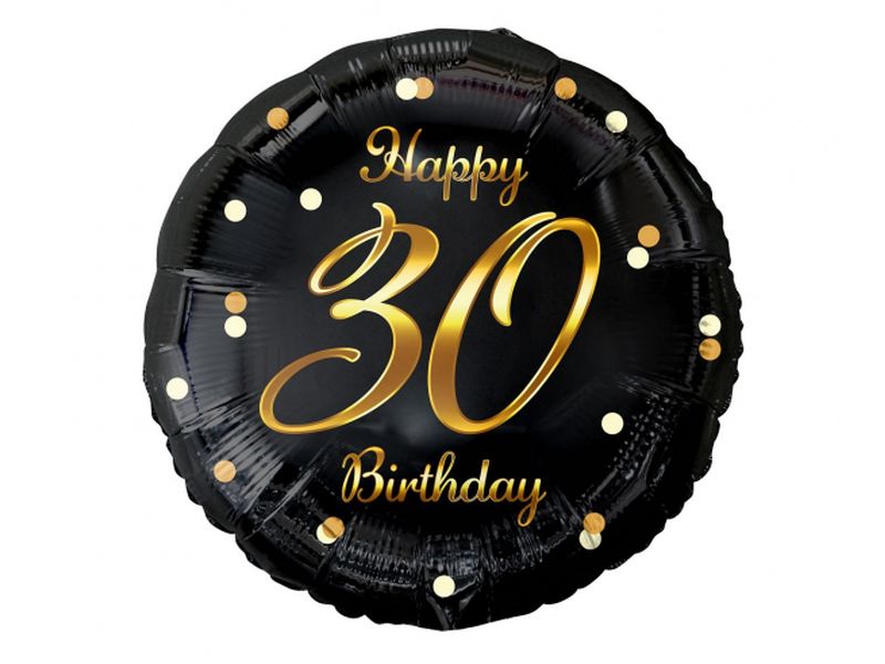 Balon foliowy z helem „B&C Happy 30 Birthday”, czarny, nadruk złoty, 45 cm (18 cali)