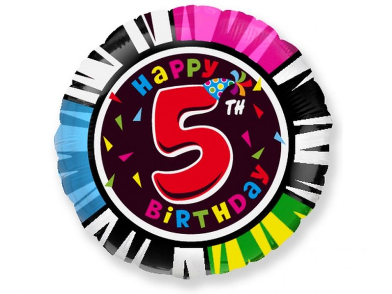 Balon foliowy napełniony helem w kształcie jak na zdjęciu z nadrukiem urodzinowym „Happy Birthday – z cyfrą 5” został wykonany z mocnej, wytrzymałej folii w kolorach zgodnych z kartą produktu.