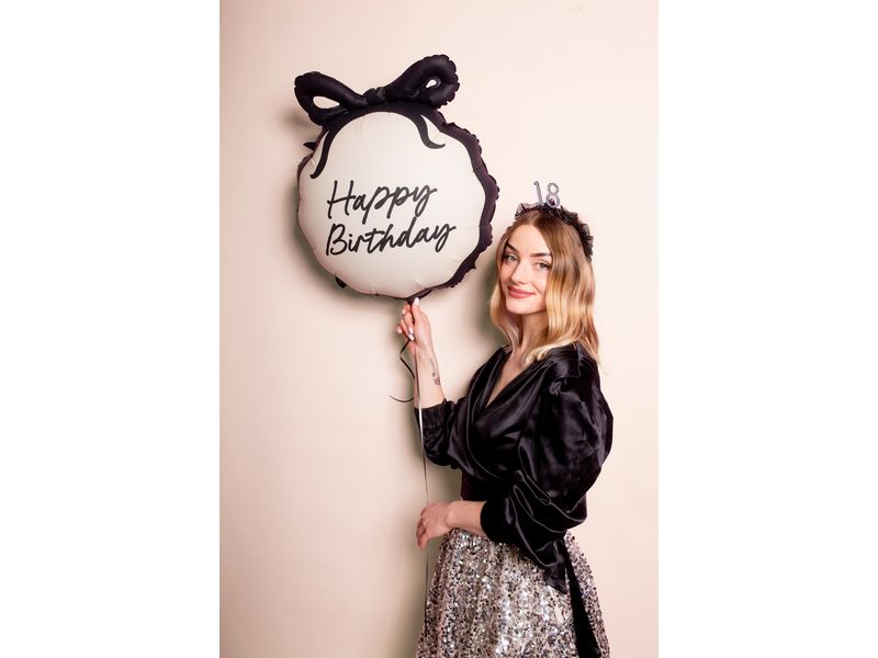 Balon foliowy z helem „Happy Birthday z kokardką (pastylka)”, czarny, 45 cm (18 cali)