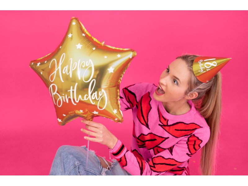 Balon foliowy napełniony helem w kształcie gwiazdy z nadrukiem urodzinowym o wielkości 40 cm został wykonany z mocnej, wytrzymałej folii w kolorze zgodnym z kartą produktu.