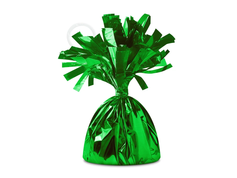 Ciężarek do balonów foliowych lub lateksowych owinięty w dekoracyjną folię o kolorze zielonym. Wysokość ciężarka w zależności od dostawy to 5 cm – 7 cm o wadze od ok. 130 g do 150 g.