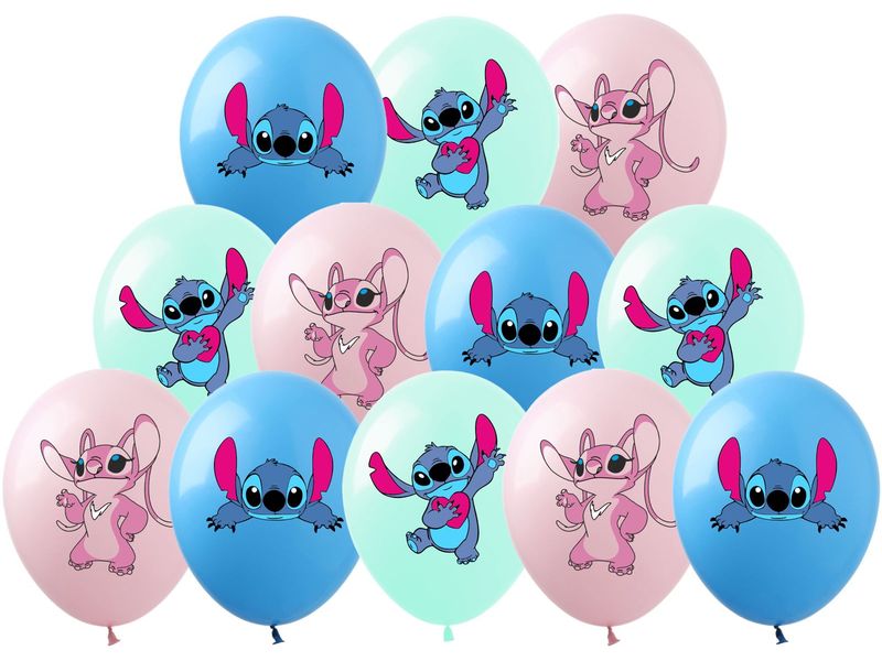 Zestaw balonów lateksowych napełniony helem o wielkości 12 cali (26 cm), w komplecie jest 12 sztuk z nadrukiem Lilo i Stich. Zostały wykonane z mocnego, wytrzymałego lateksu w kolorach jak na zdjęciu. W komplecie znajdziemy: